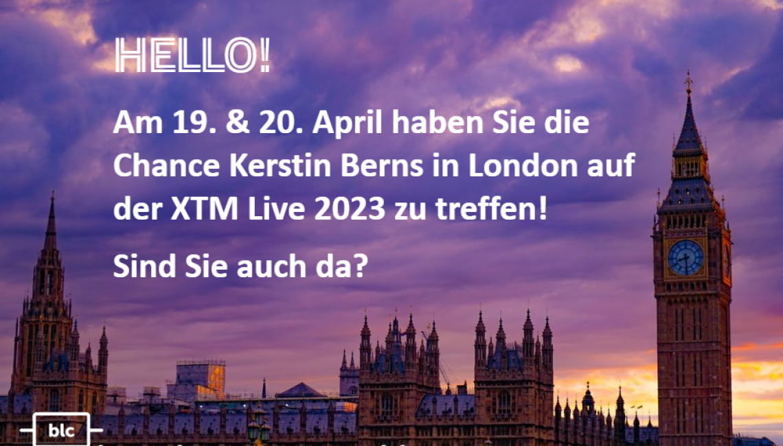 Dieses Jahr findet die XTM Live 2023 in London statt. Kerstin Berns wird am 19. & 20. April vor Ort sein. Möchten Sie sie treffen und über Strategie oder andere Themen rund um Translation reden? Vereinbaren Sie schon jetzt einen Gesprächstermin mit Kerstin Berns. Stichwort: XTM.