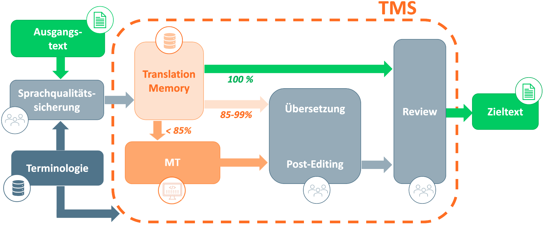 Mit dem Einsatz von MT und LLMs verändern sich auch die bestehenden Prozesse. Statt klassischer Workflows mit Humanübersetzung entsteht ein Zusammenspiel aus Translation Memory, MT und weiterführender KI. Terminologiedaten sollten dabei aktiv integriert werden, beispielsweise als MT-Glossare.